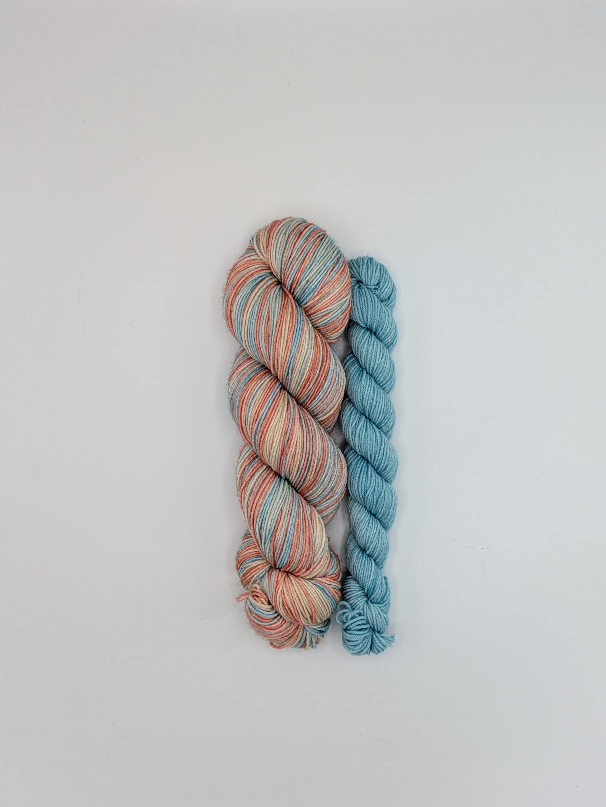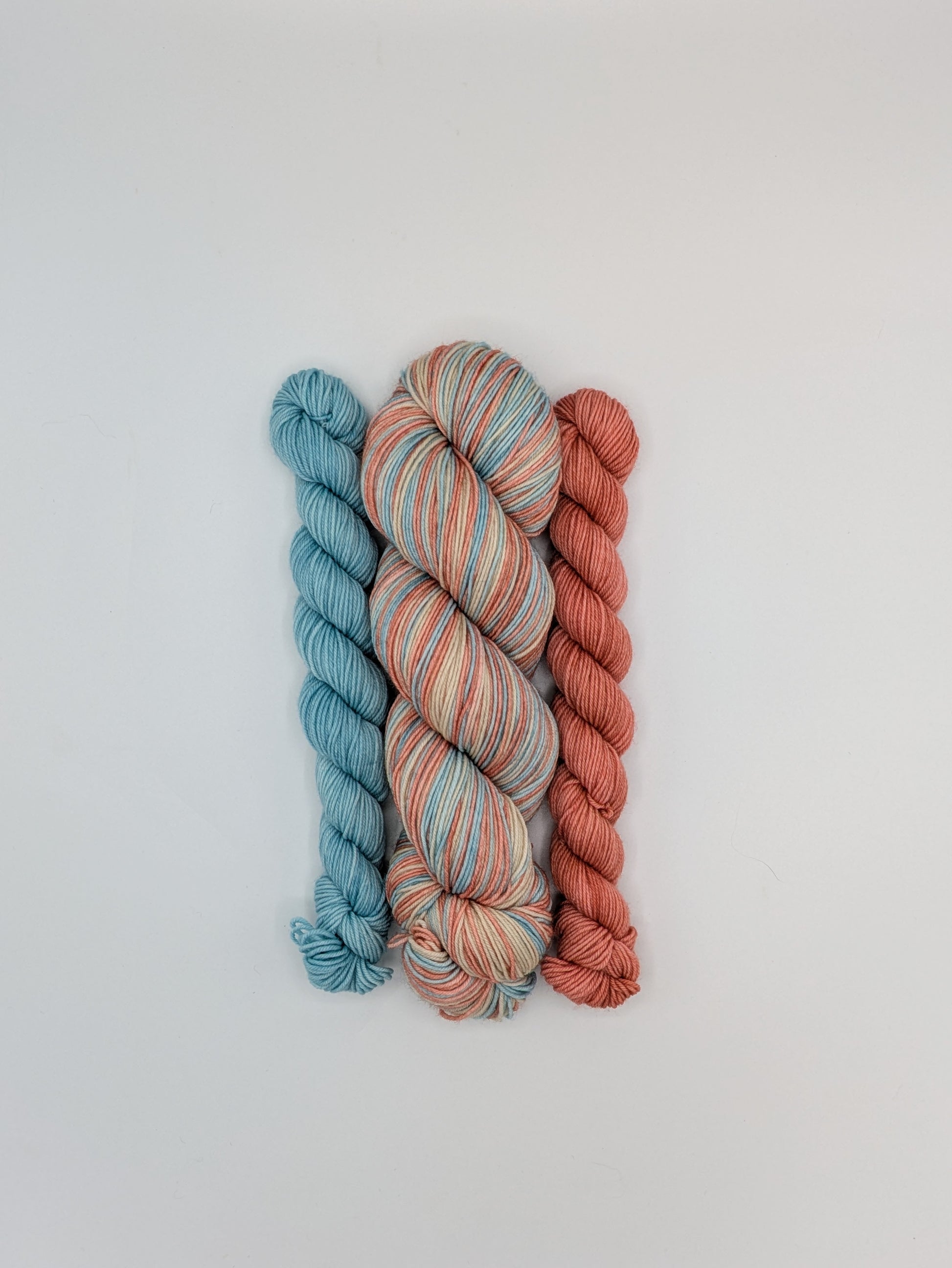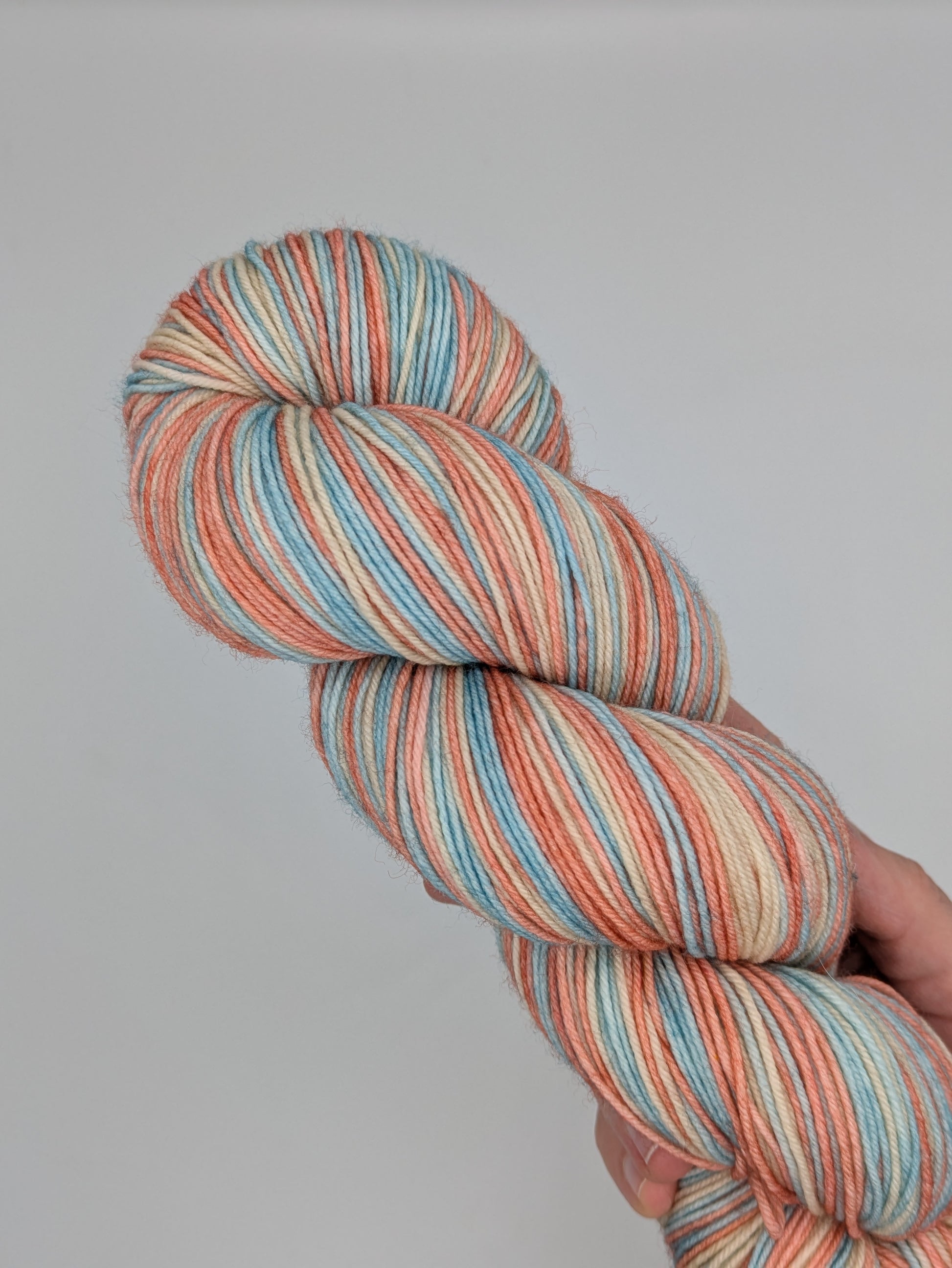 Beach Vacation is a self-striping yarn featuring even stripes of a pale cream with the softest yellow undertone, a medium blue and a salmon orange.