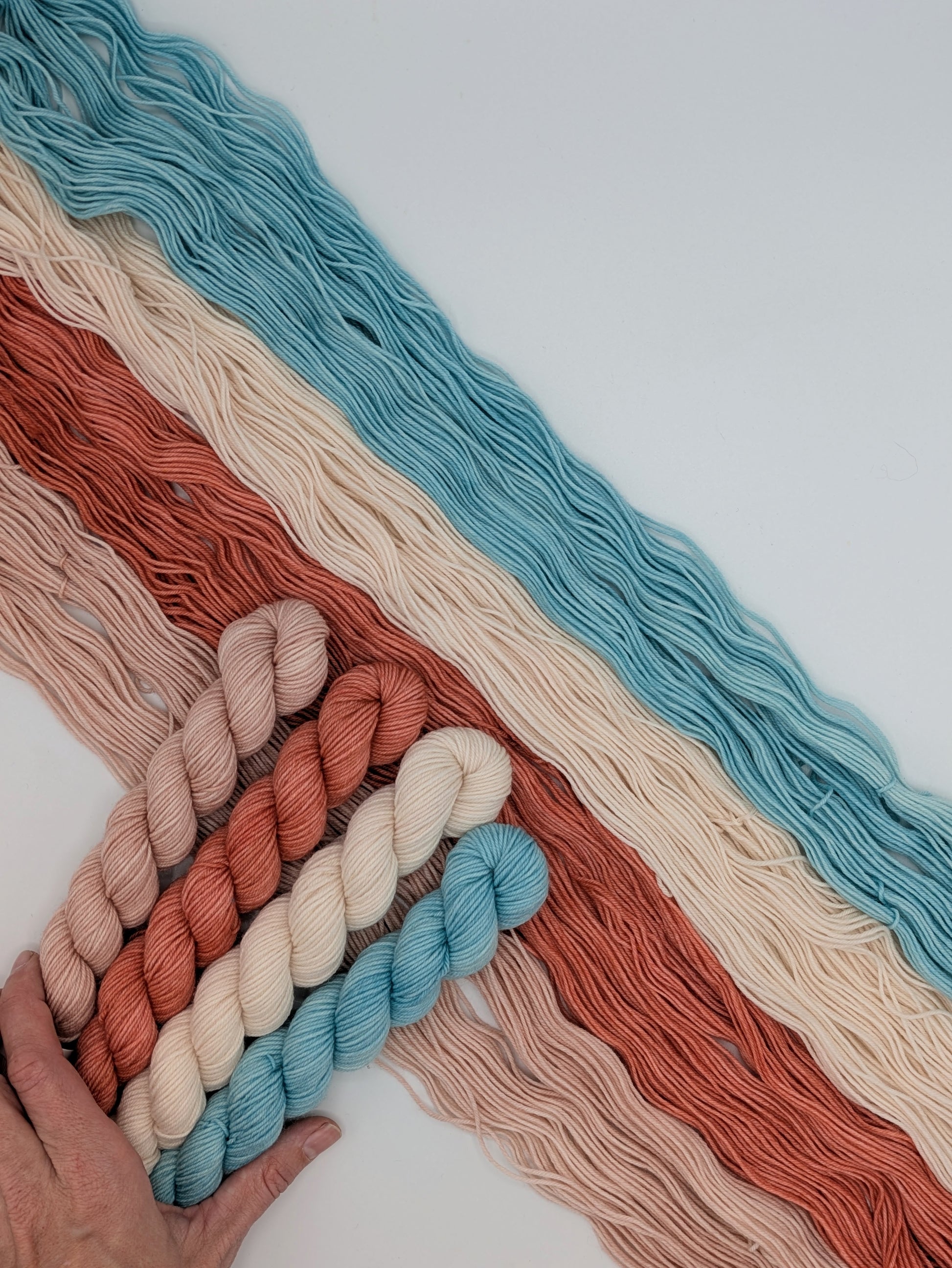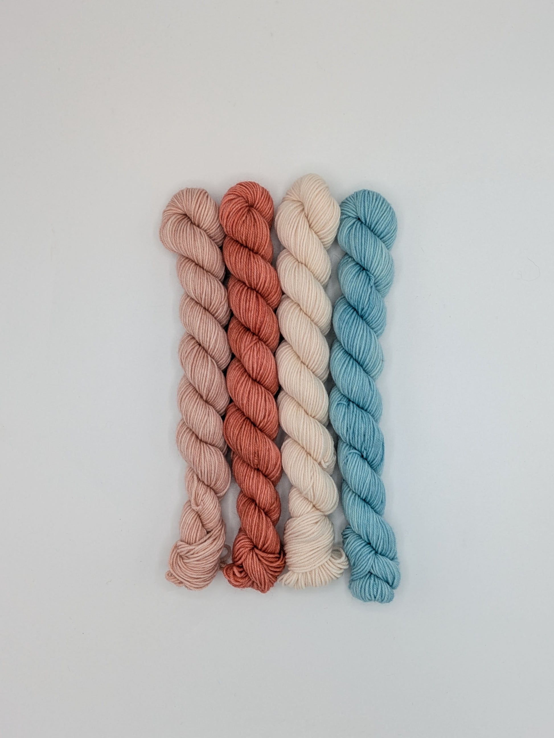 Your bundle will include 4 mini skeins of 20g each in the coordinating colors to knit Professor Fungi Gnome or another pattern of your choosing. Pattern is not included and is available through Imagined Landscapes.