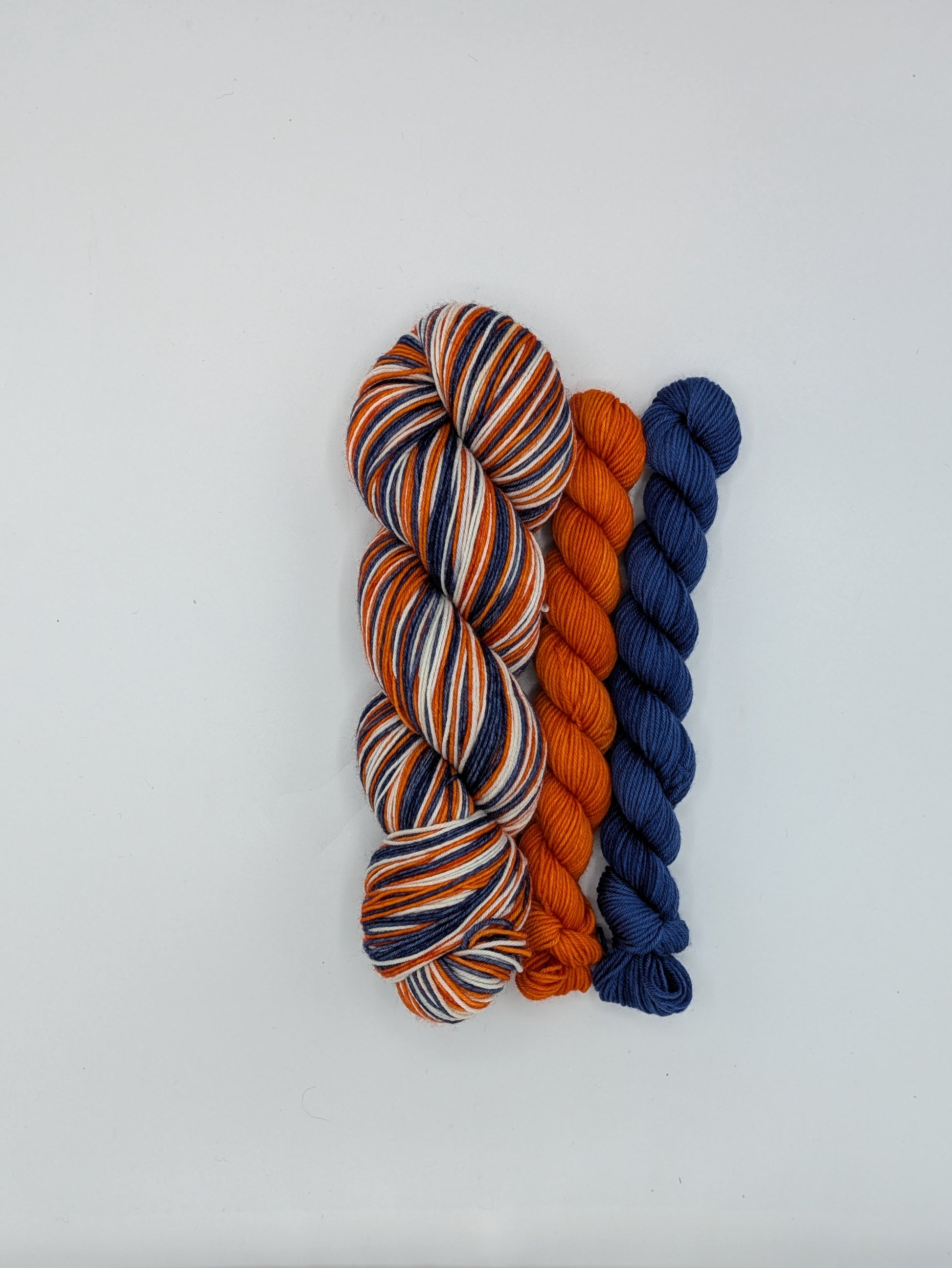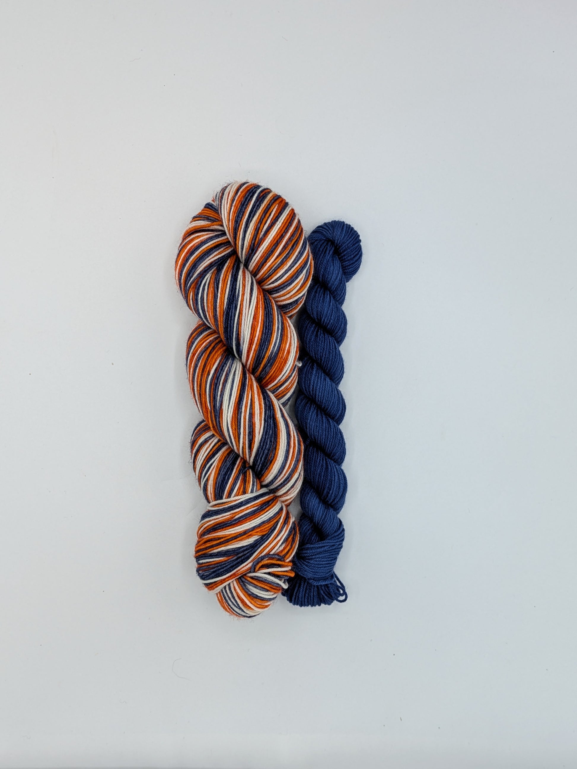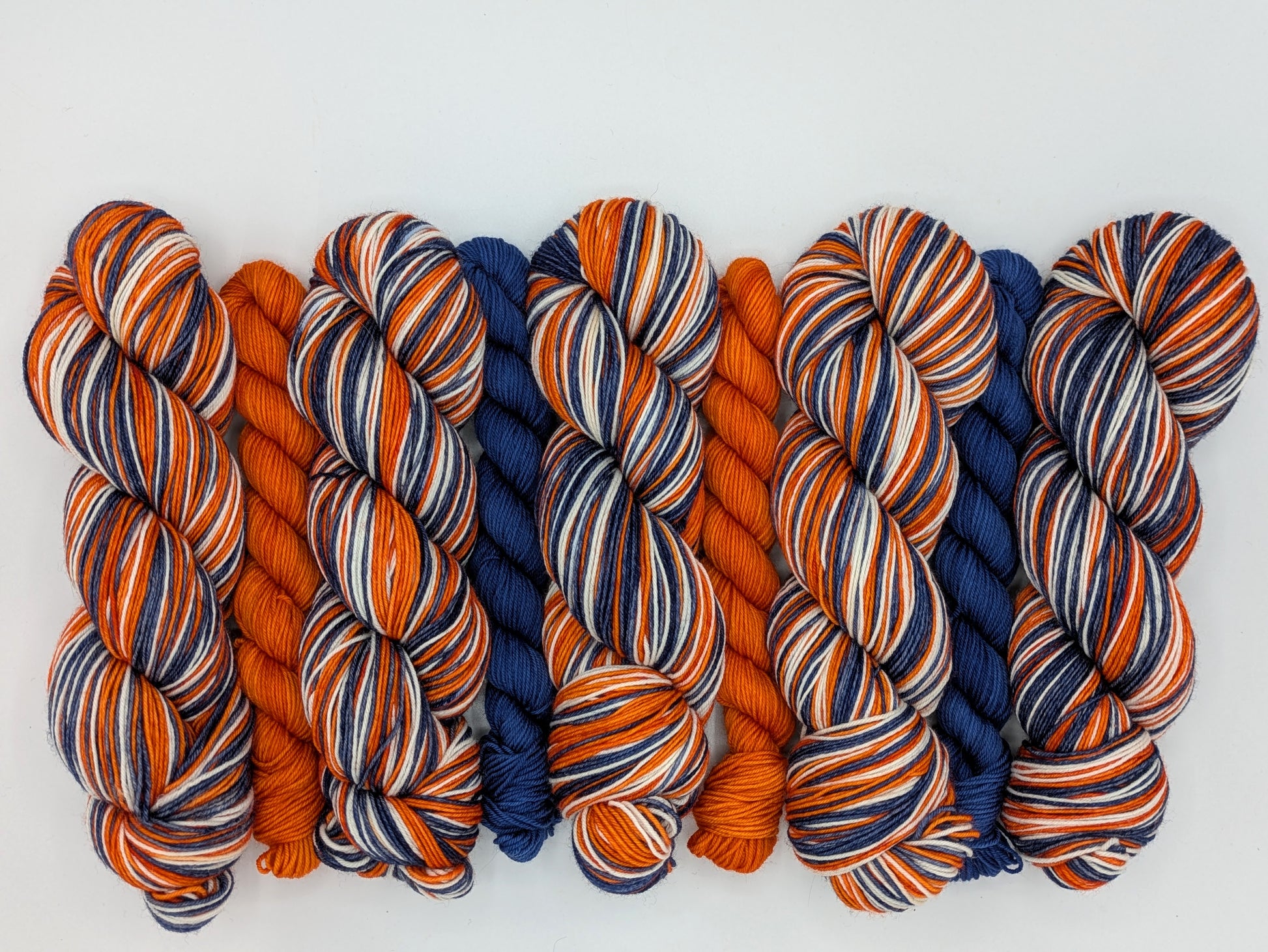 First Down is a self-striping yarn featuring thick stripes of blue and orange with thin stripes of white in between. First Down is the team colors for the Denver Broncos, Chicago Bears, Edmonton Oilers, New York Mets, Syracuse University, Florida Gators and Boise State.