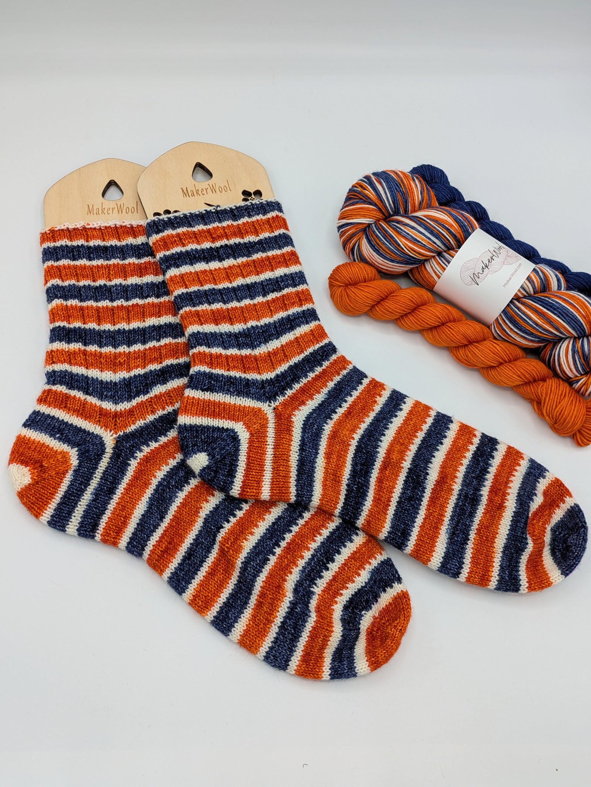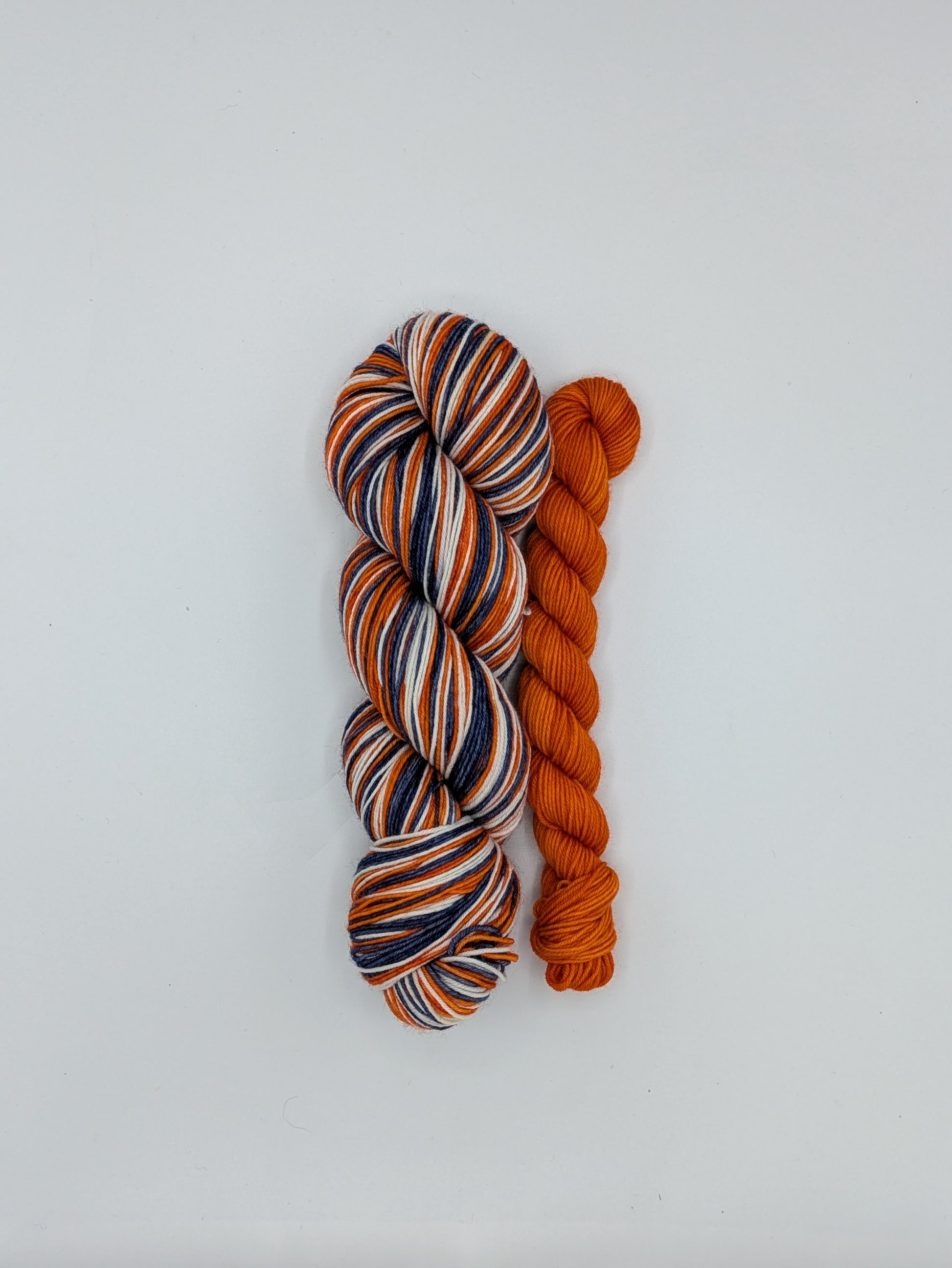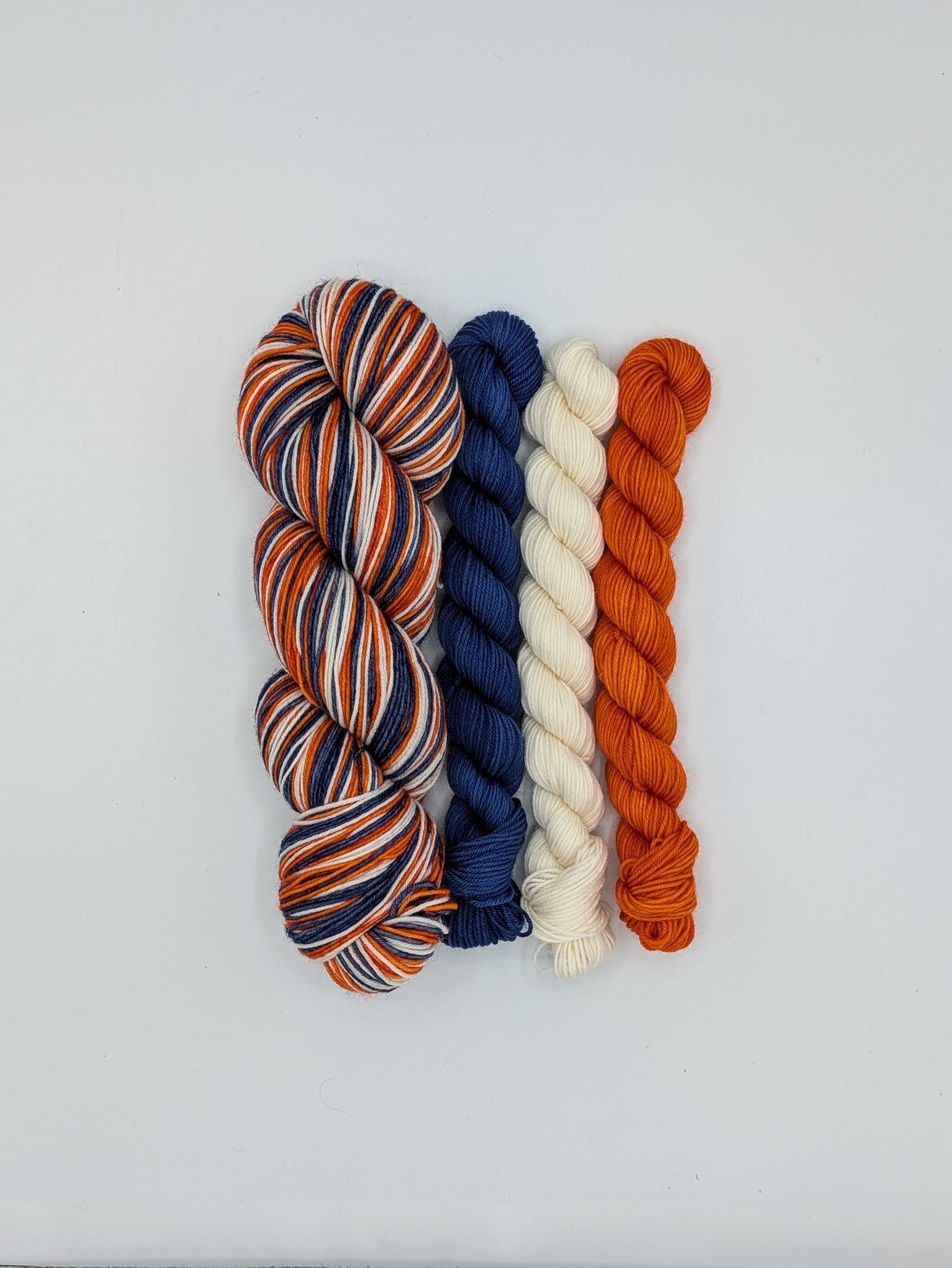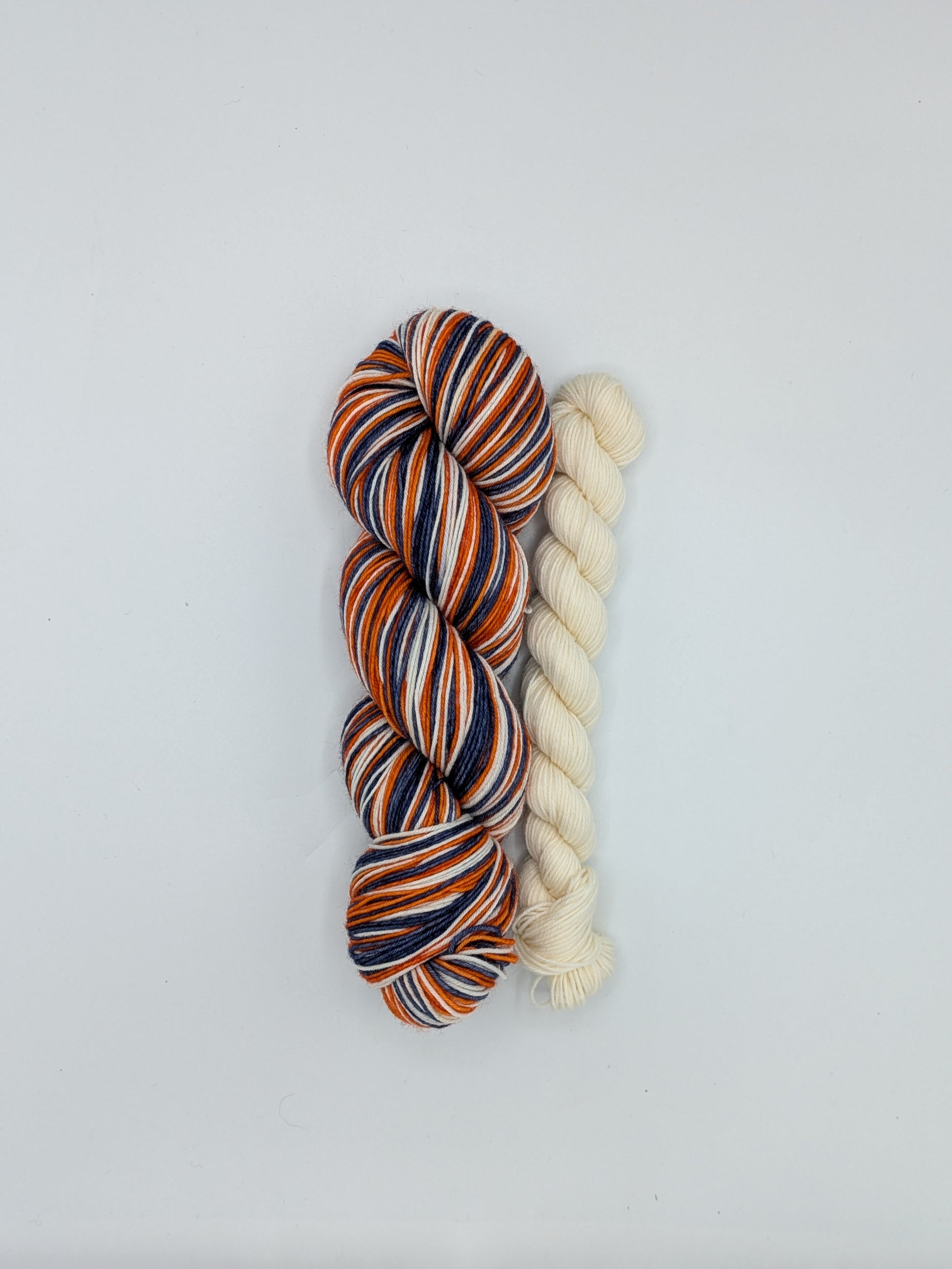 First Down is a self-striping yarn featuring thick stripes of blue and orange with thin stripes of white in between. First Down is the team colors for the Denver Broncos, Chicago Bears, Edmonton Oilers, New York Mets, Syracuse University, Florida Gators and Boise State.