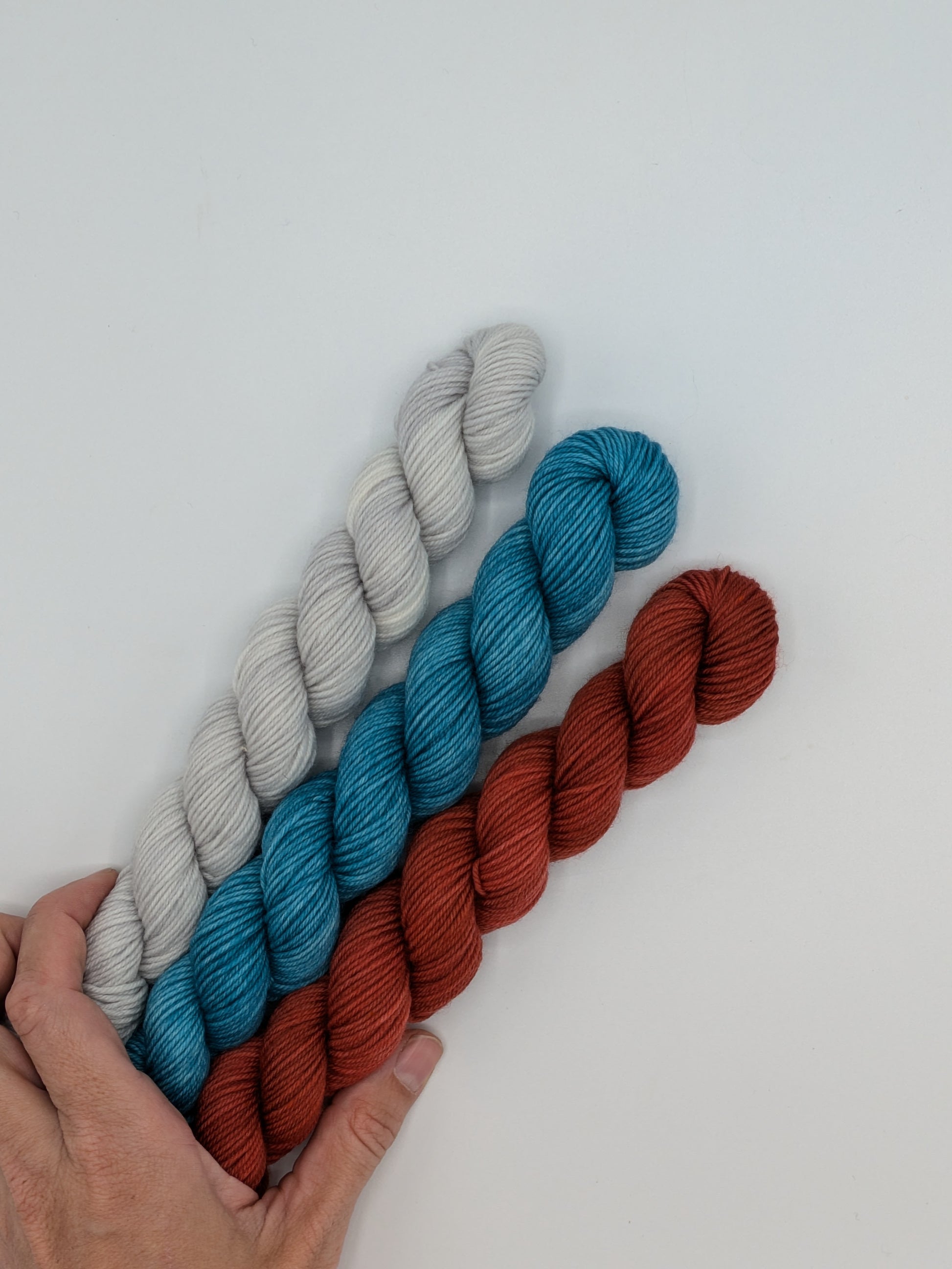 Your bundle will include 3 mini skeins of 20g each in coordinating colors to knit a gnome or another pattern of your choosing. Pattern is not included and is available through Imagined Landscapes.