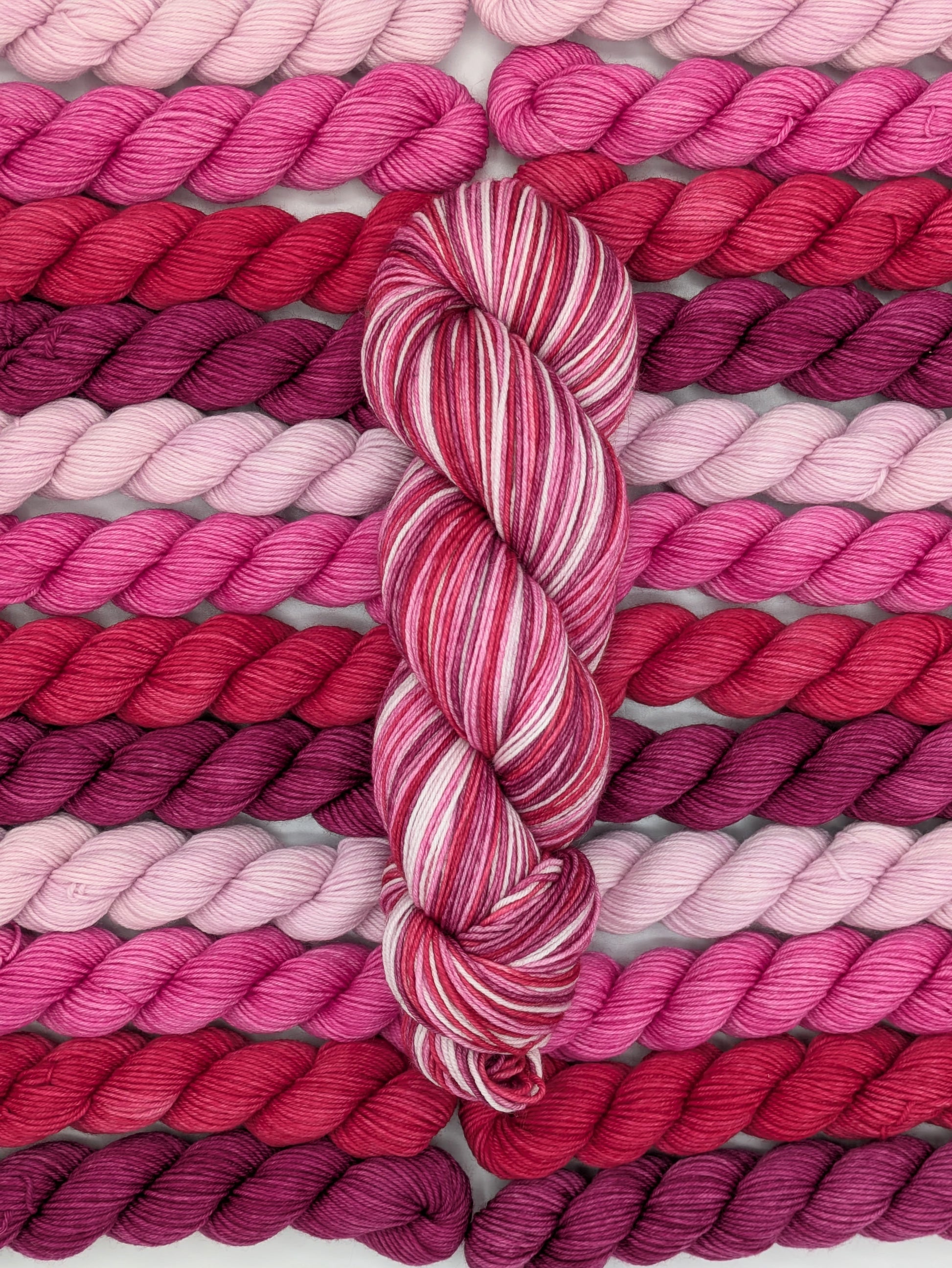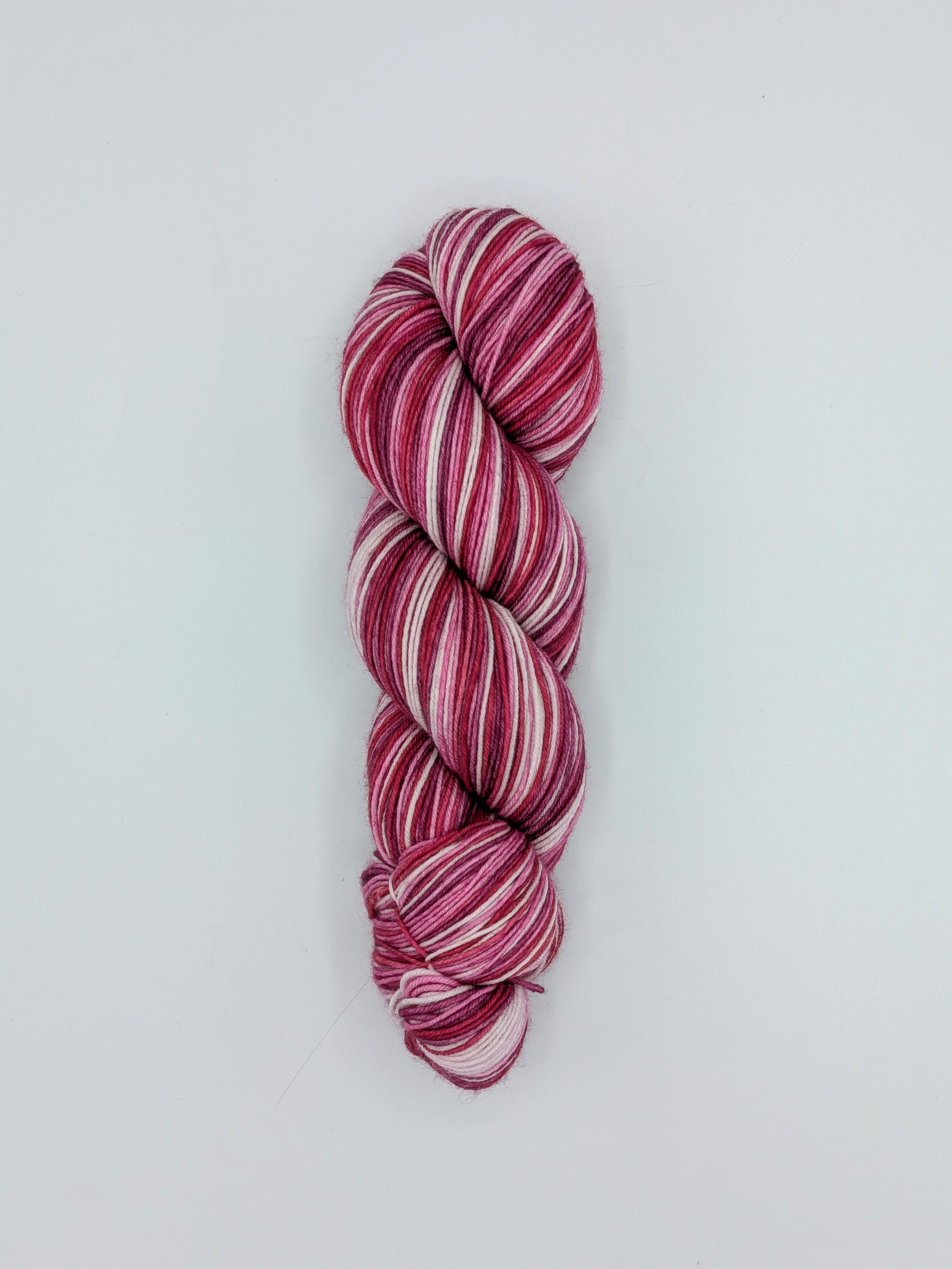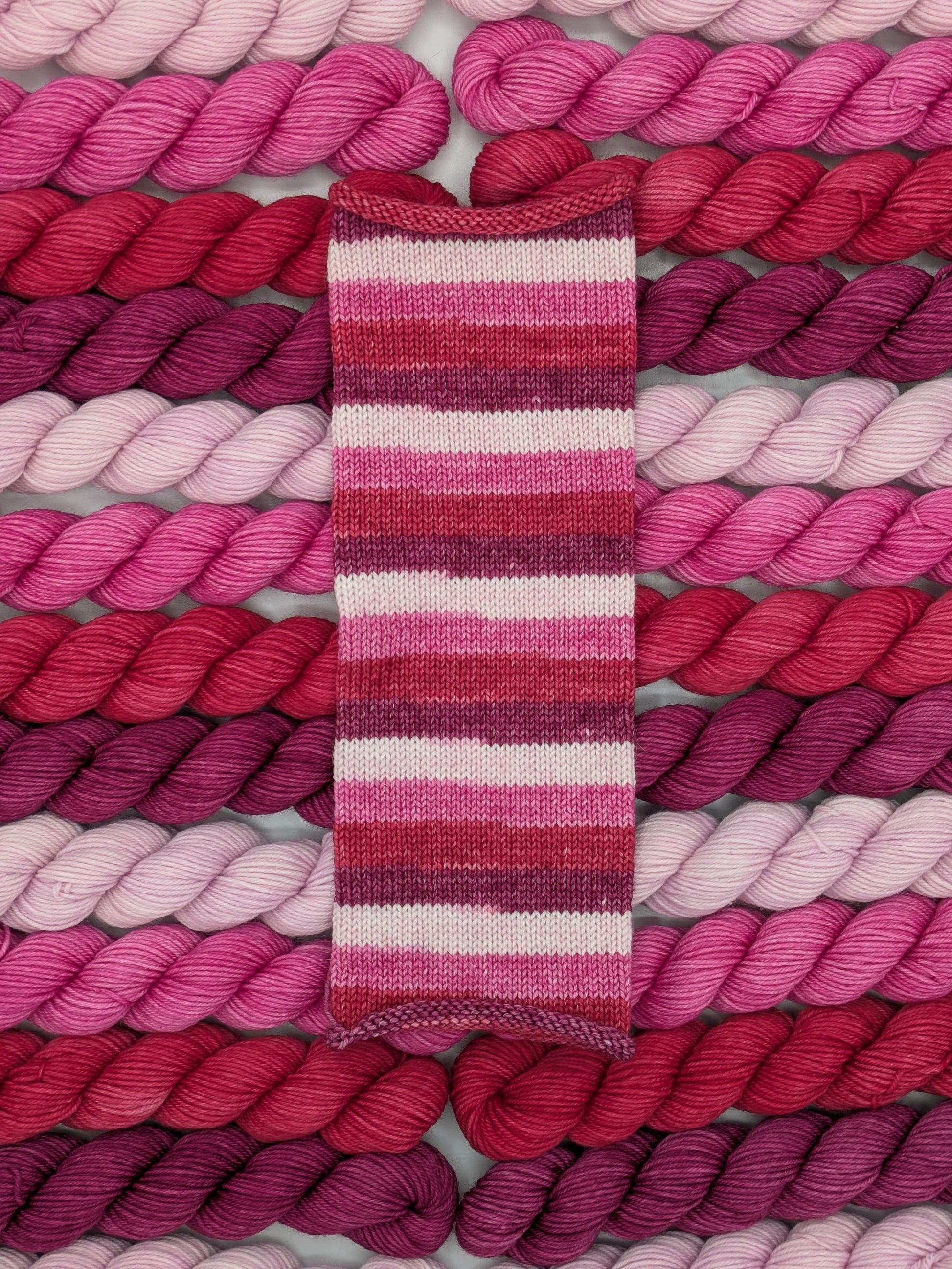 Love Yourself is a self-striping yarn featuring even width stripes of light and bright pink, red and burgundy.