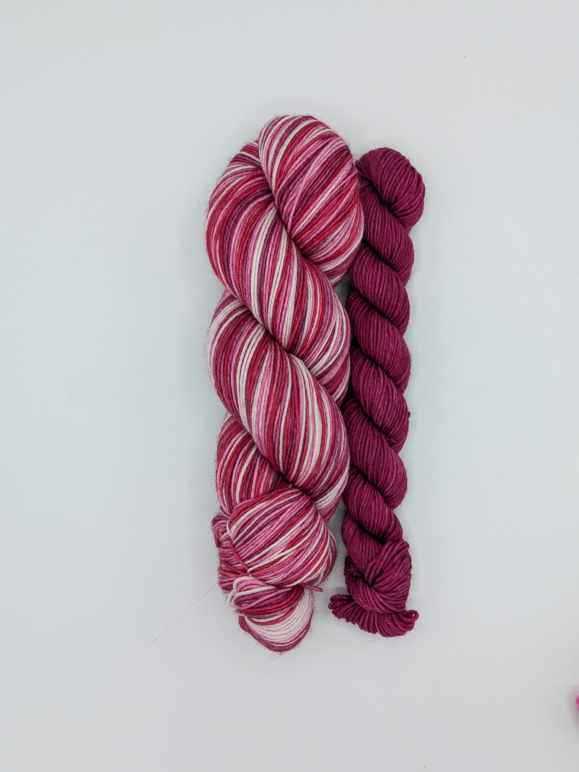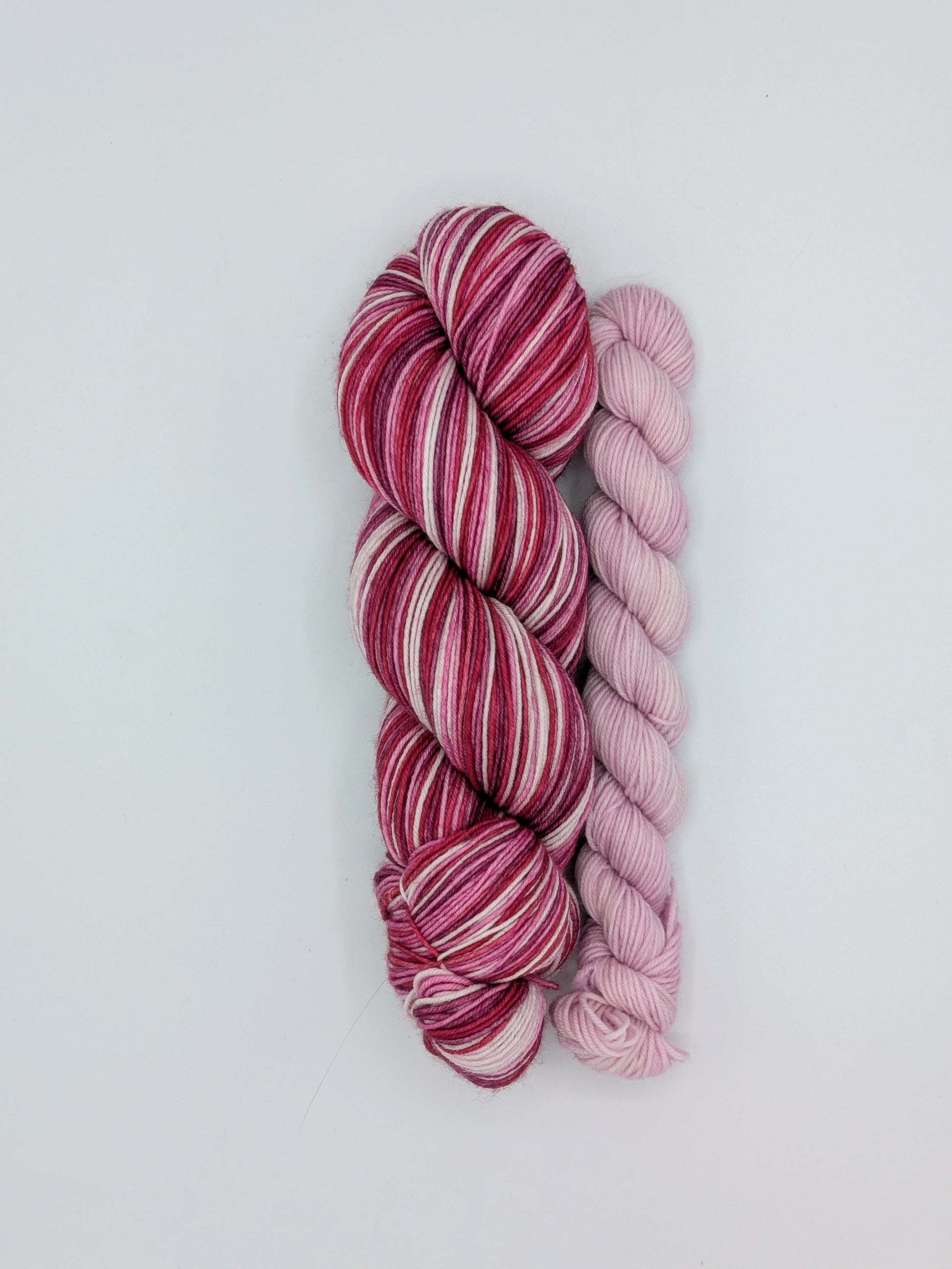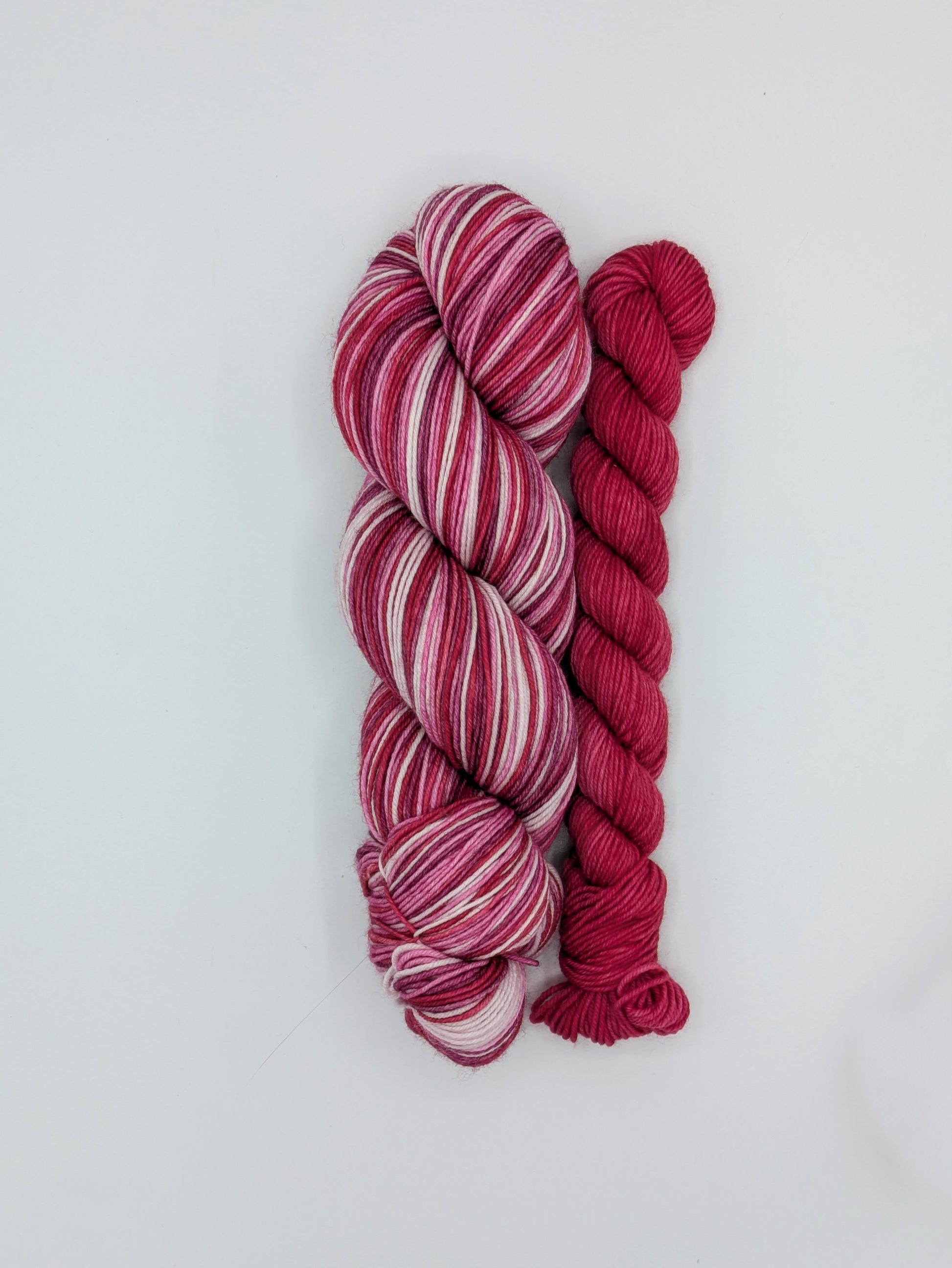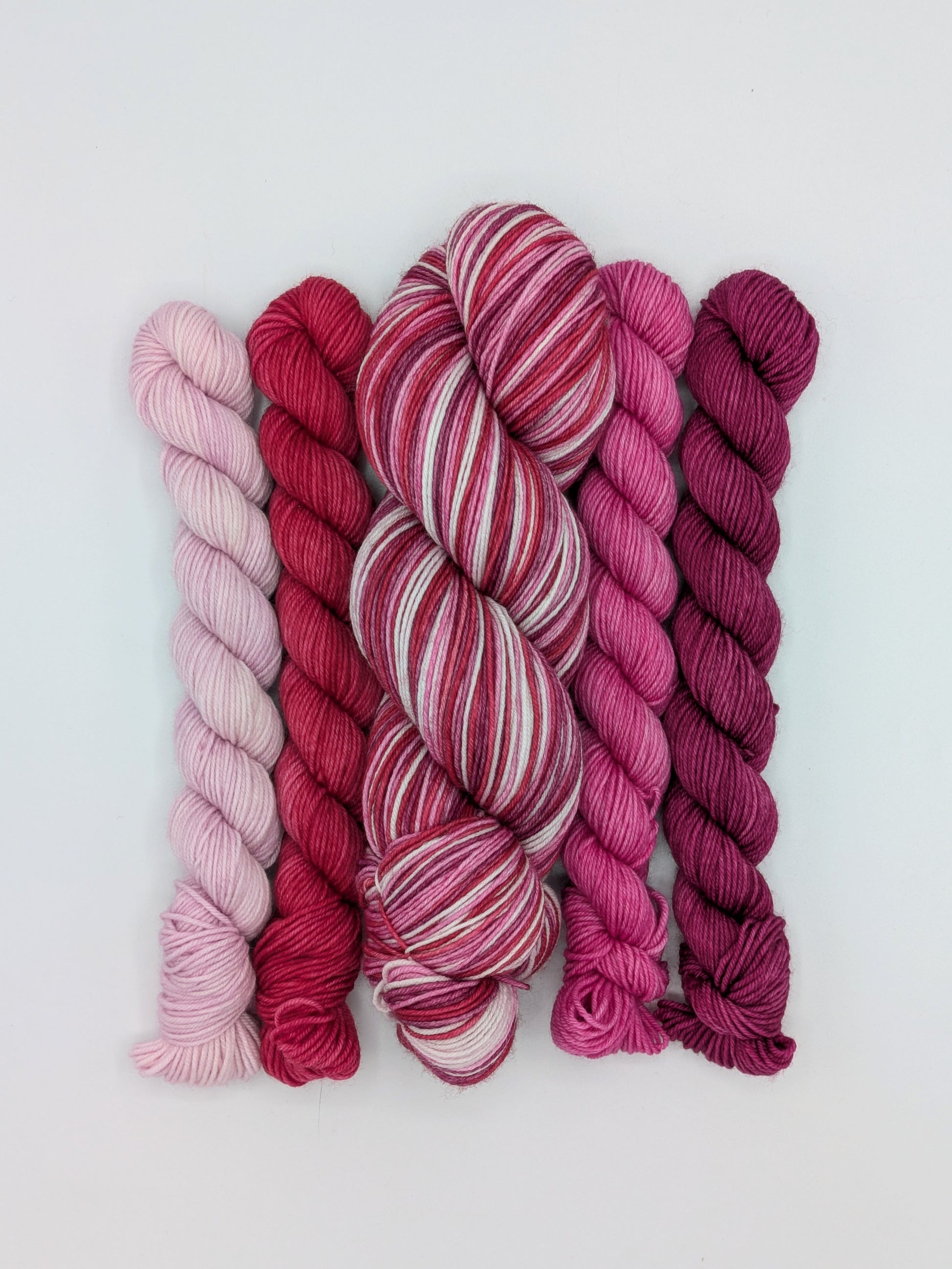 Love Yourself is a self-striping yarn featuring even width stripes of light and bright pink, red and burgundy.