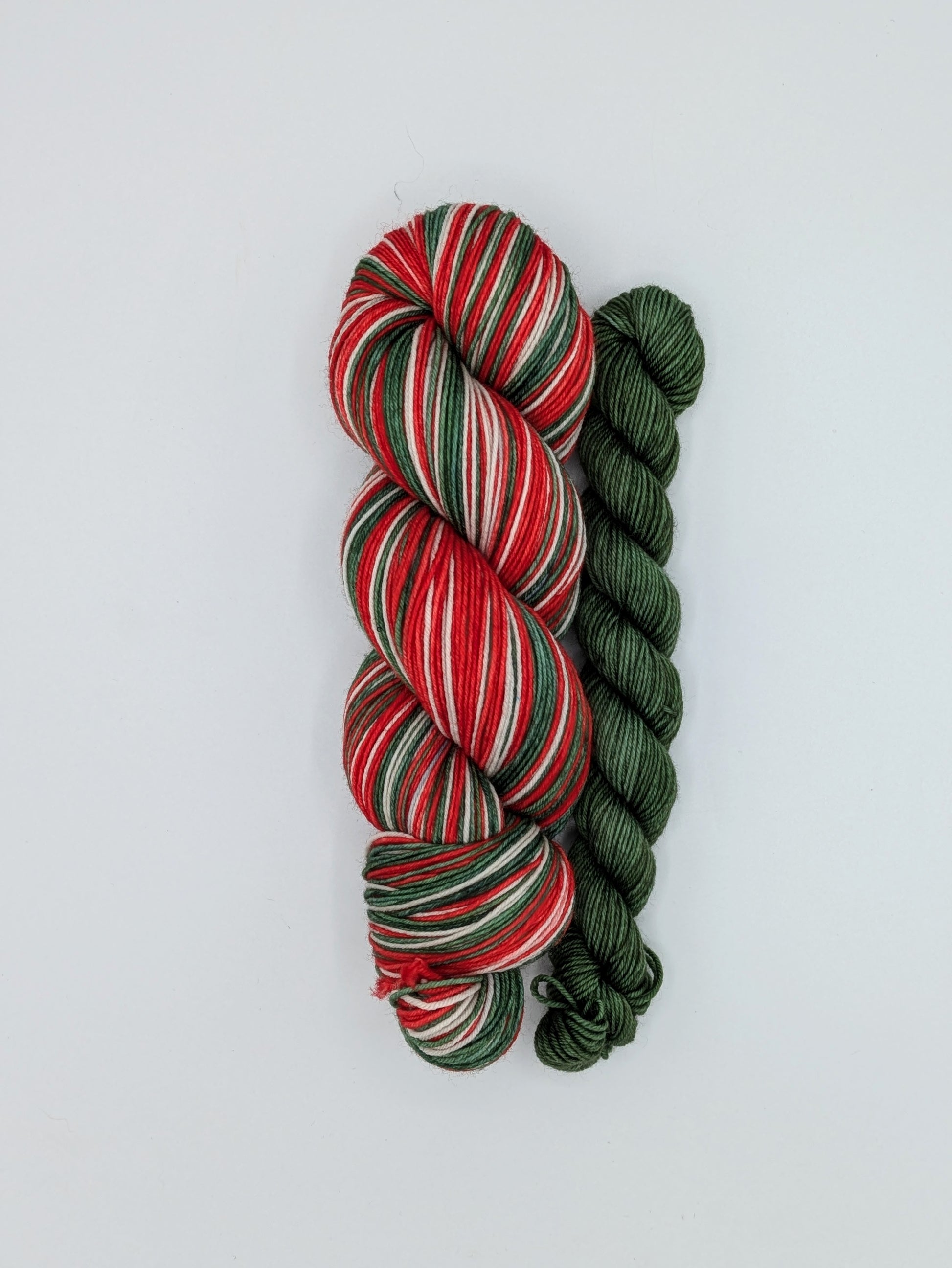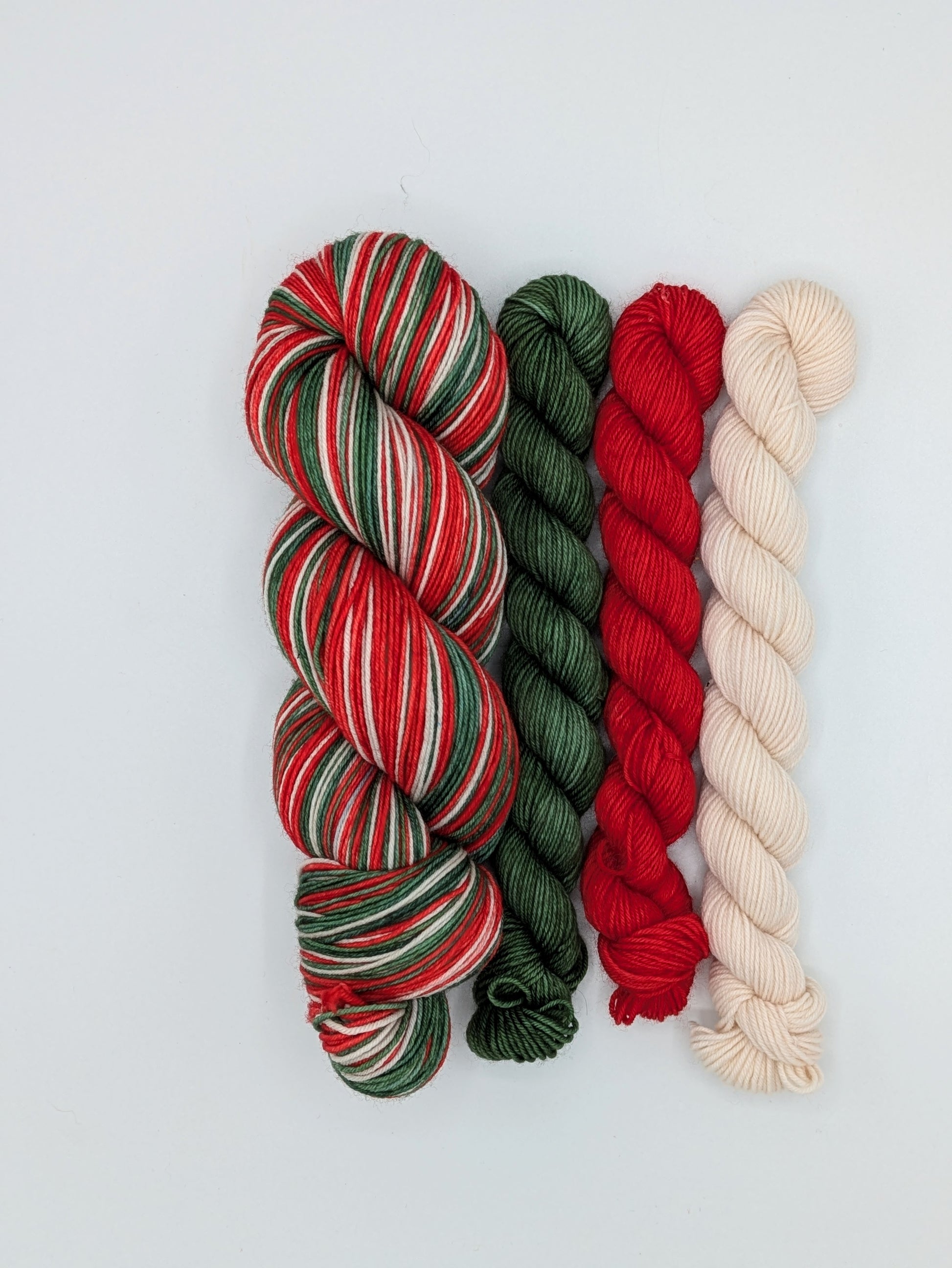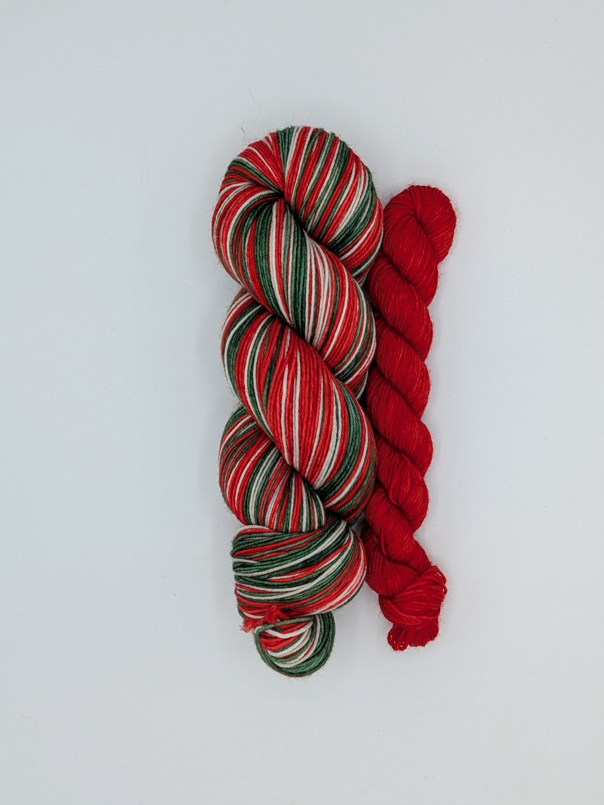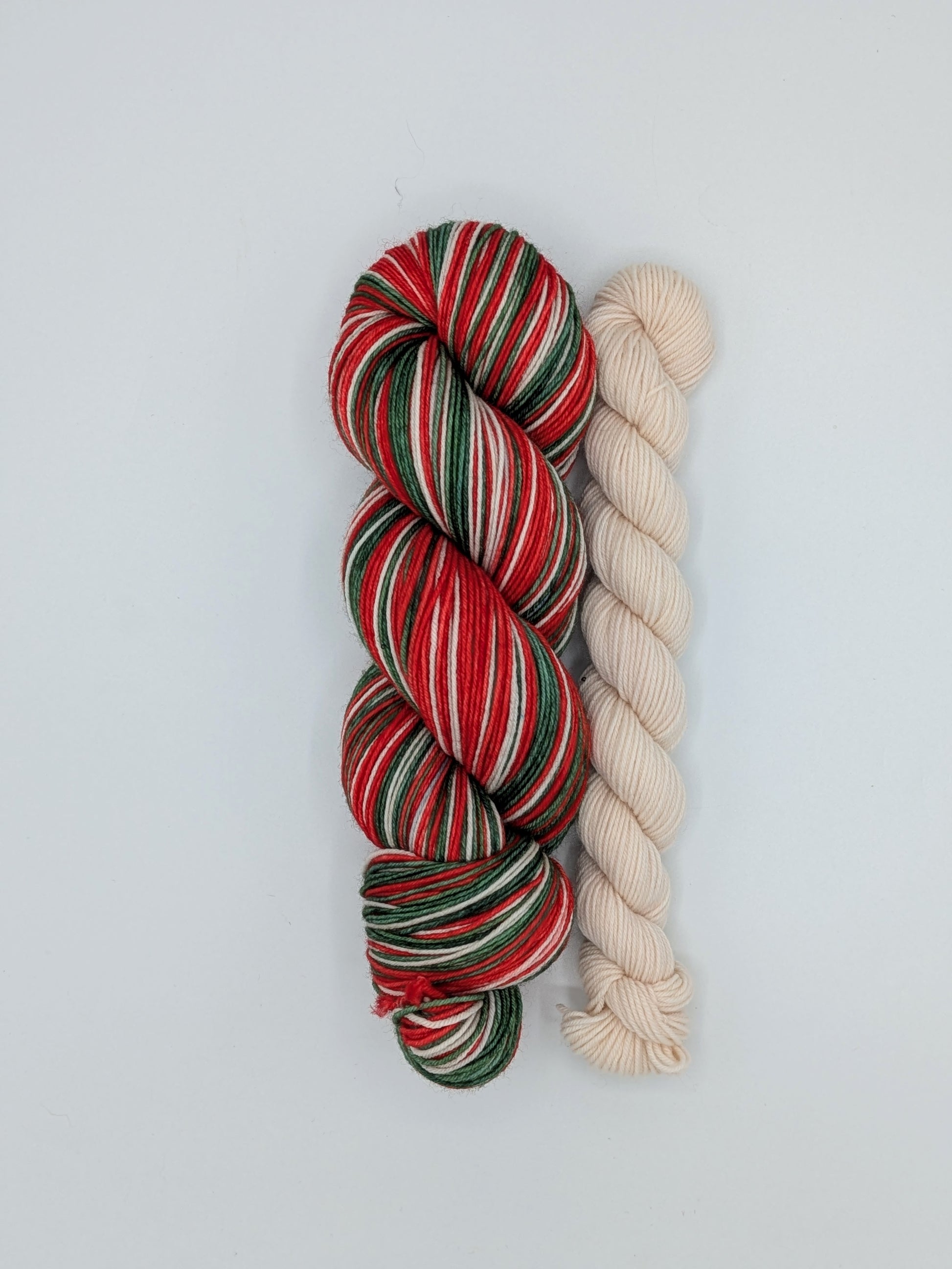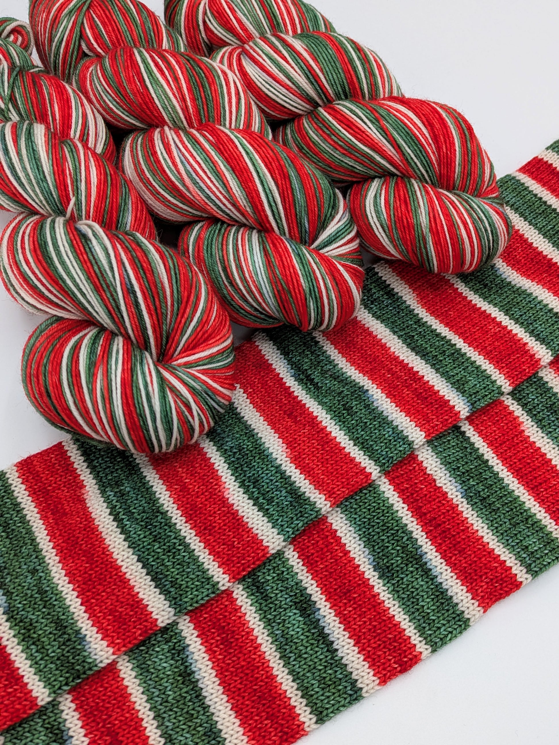 Merry and Bright is a self-striping yarn featuring alternating thick stripes of red and green with a thin stripe of soft cream in between.