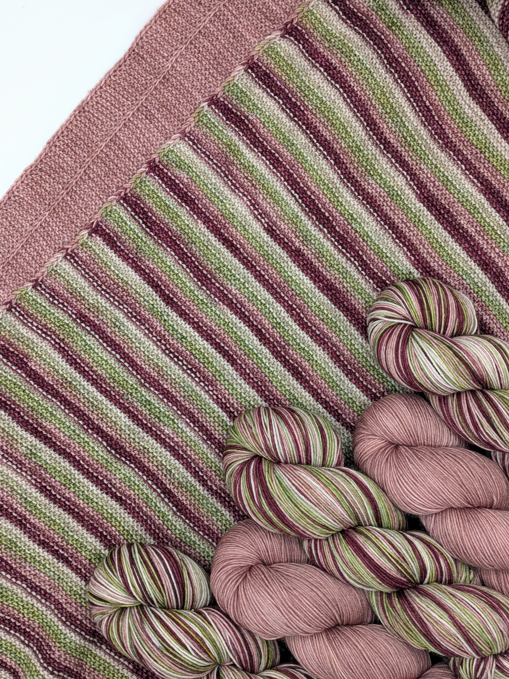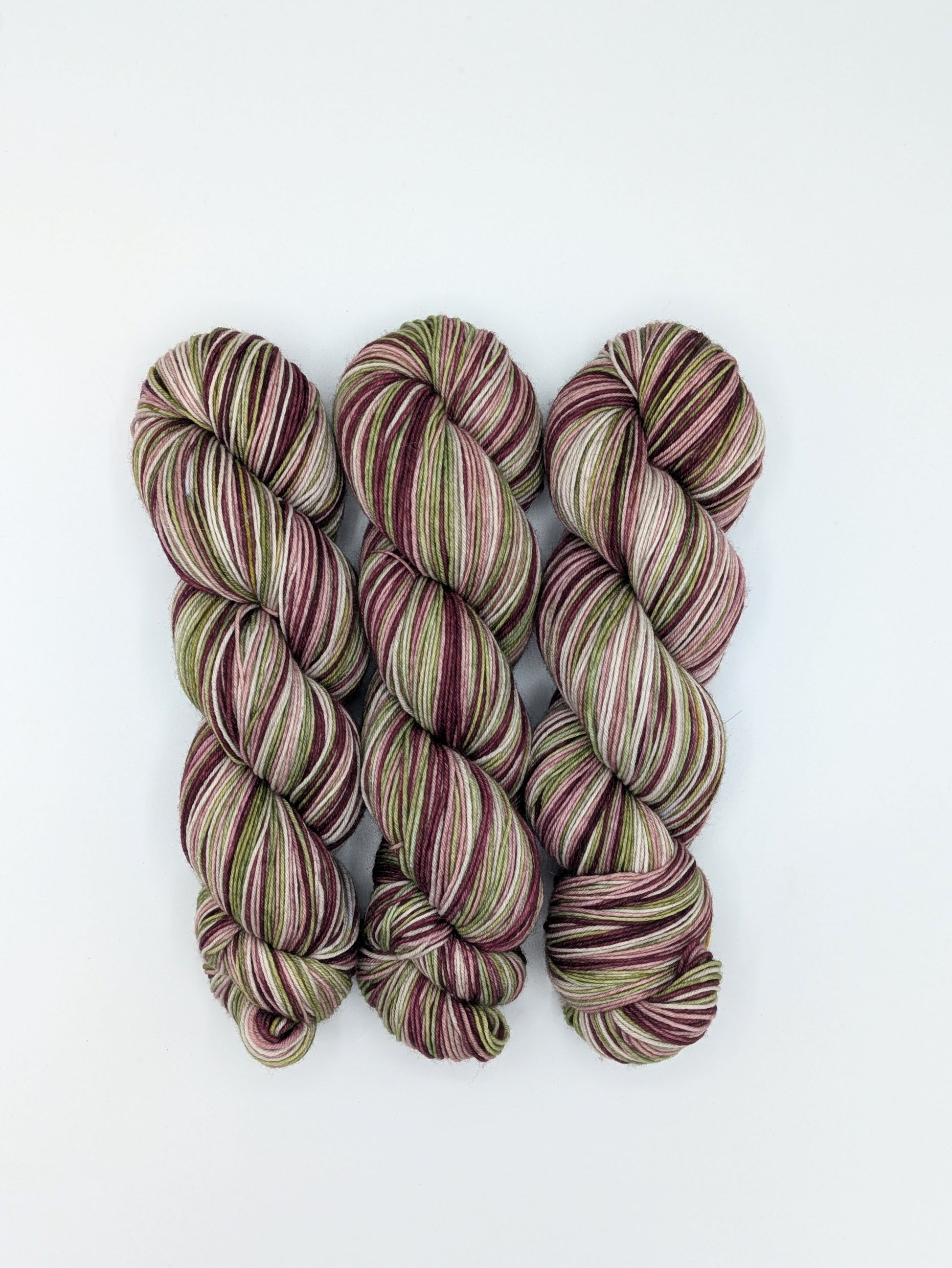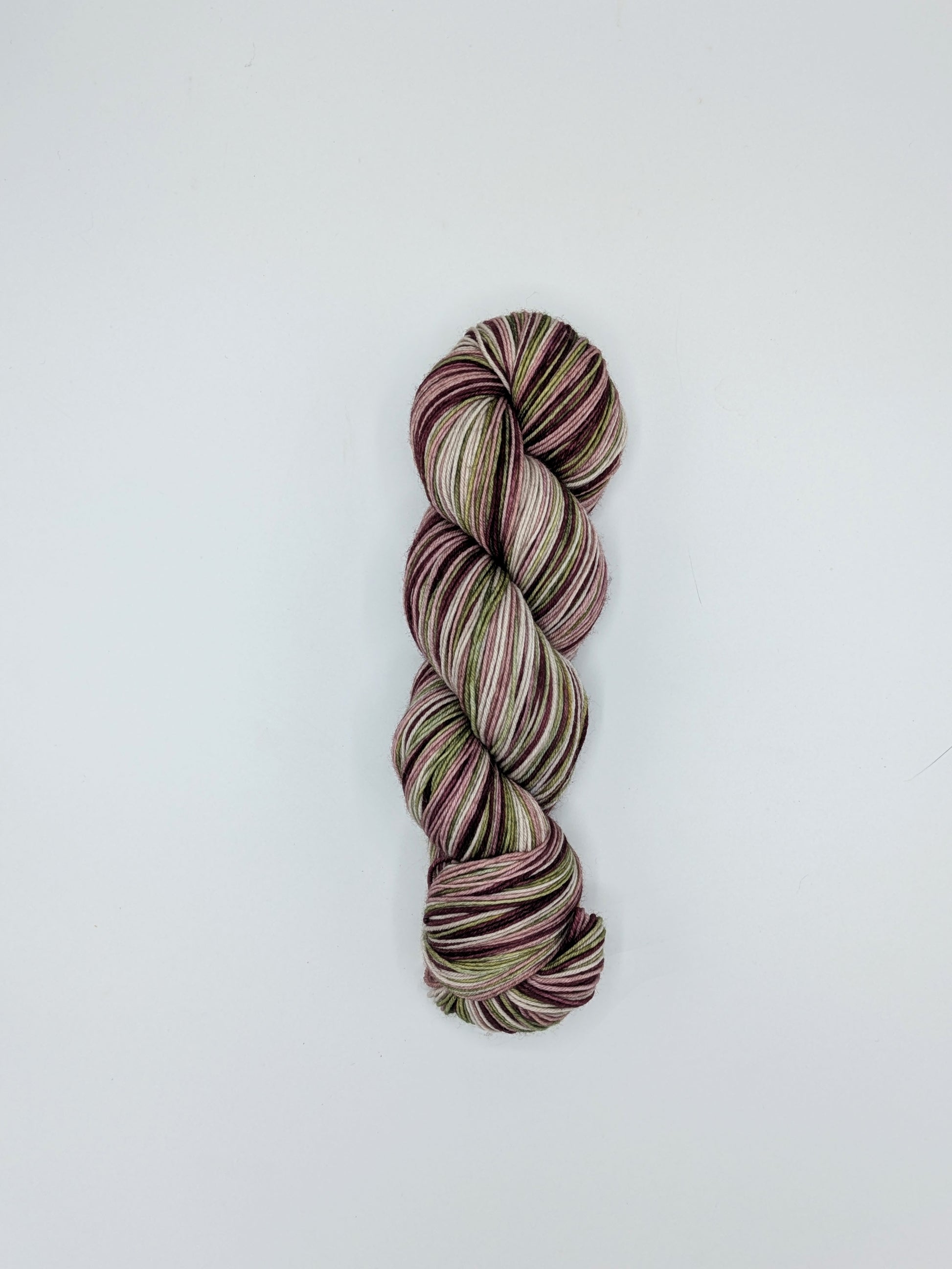 Ode to Summer is a self-striping yarn featuring even stripes of a soft green, light pink, maroon and cream.
