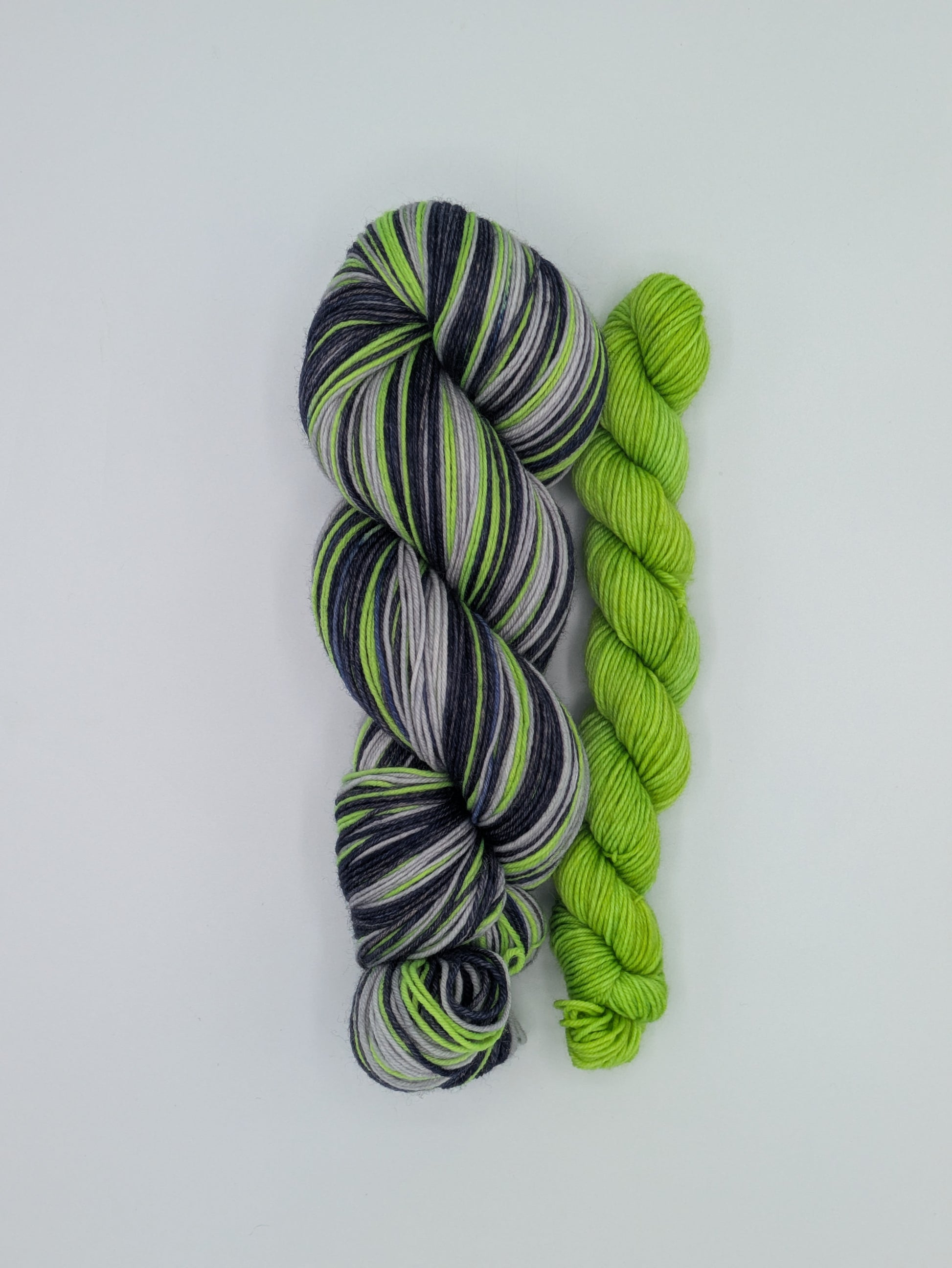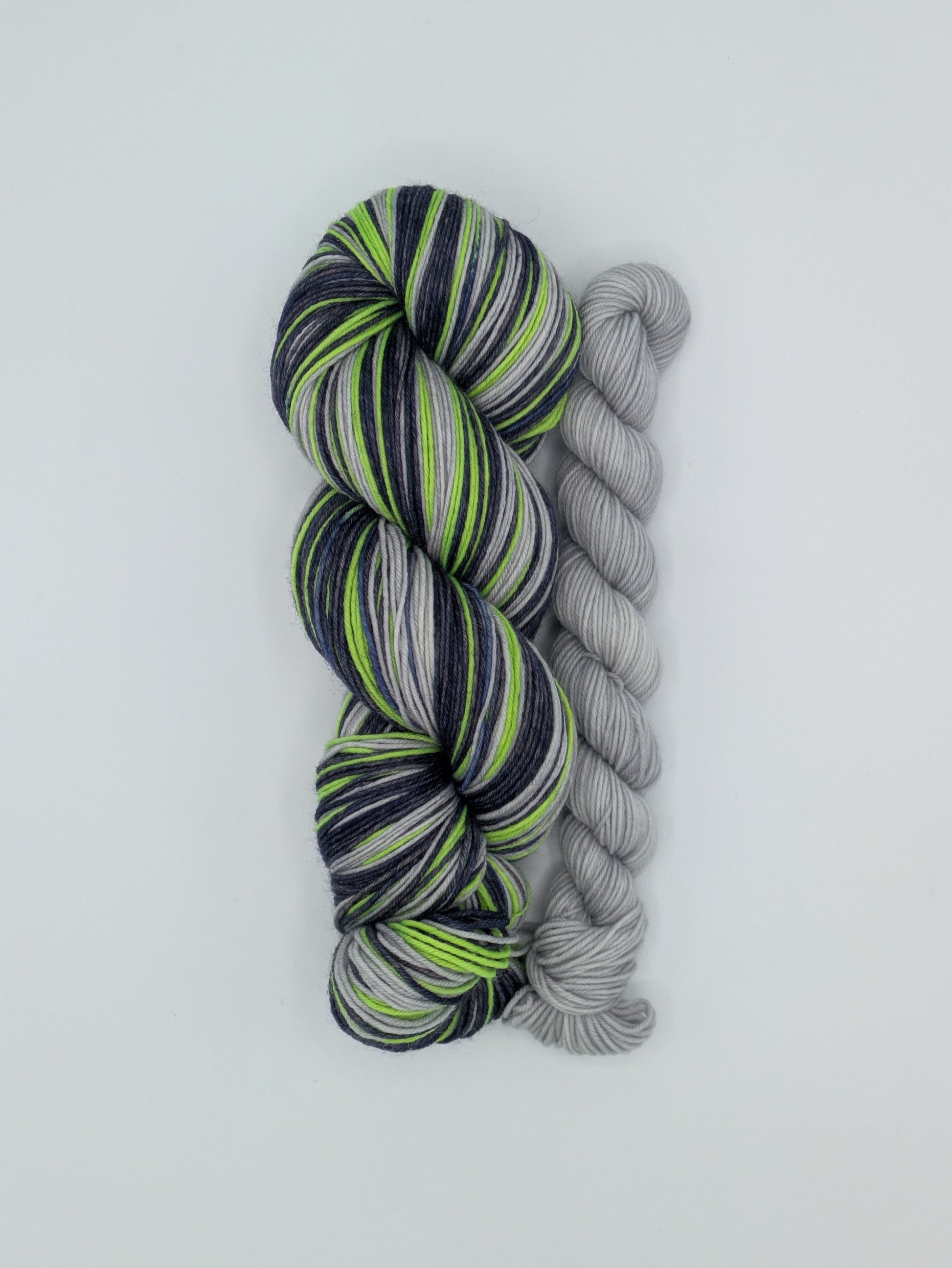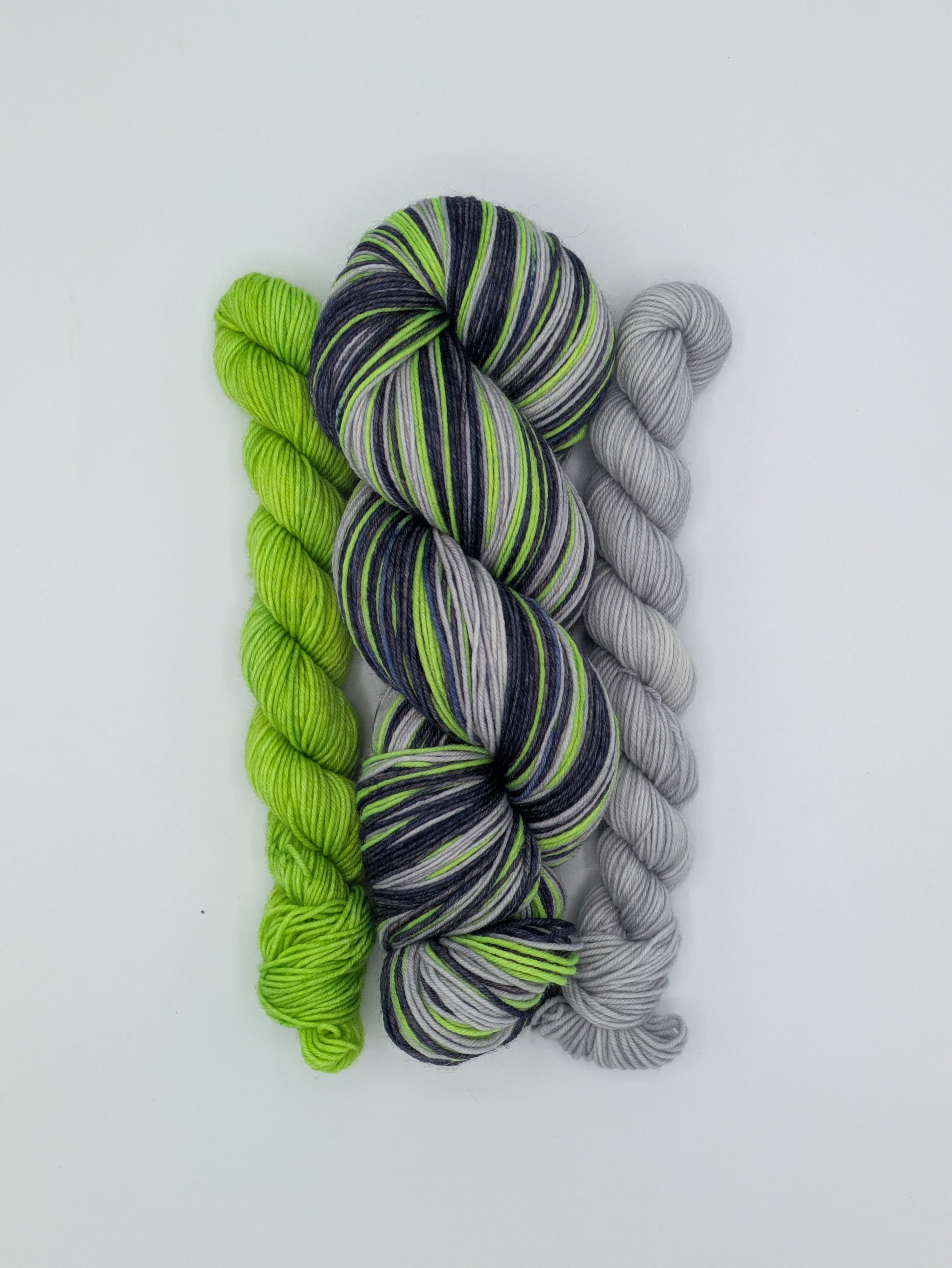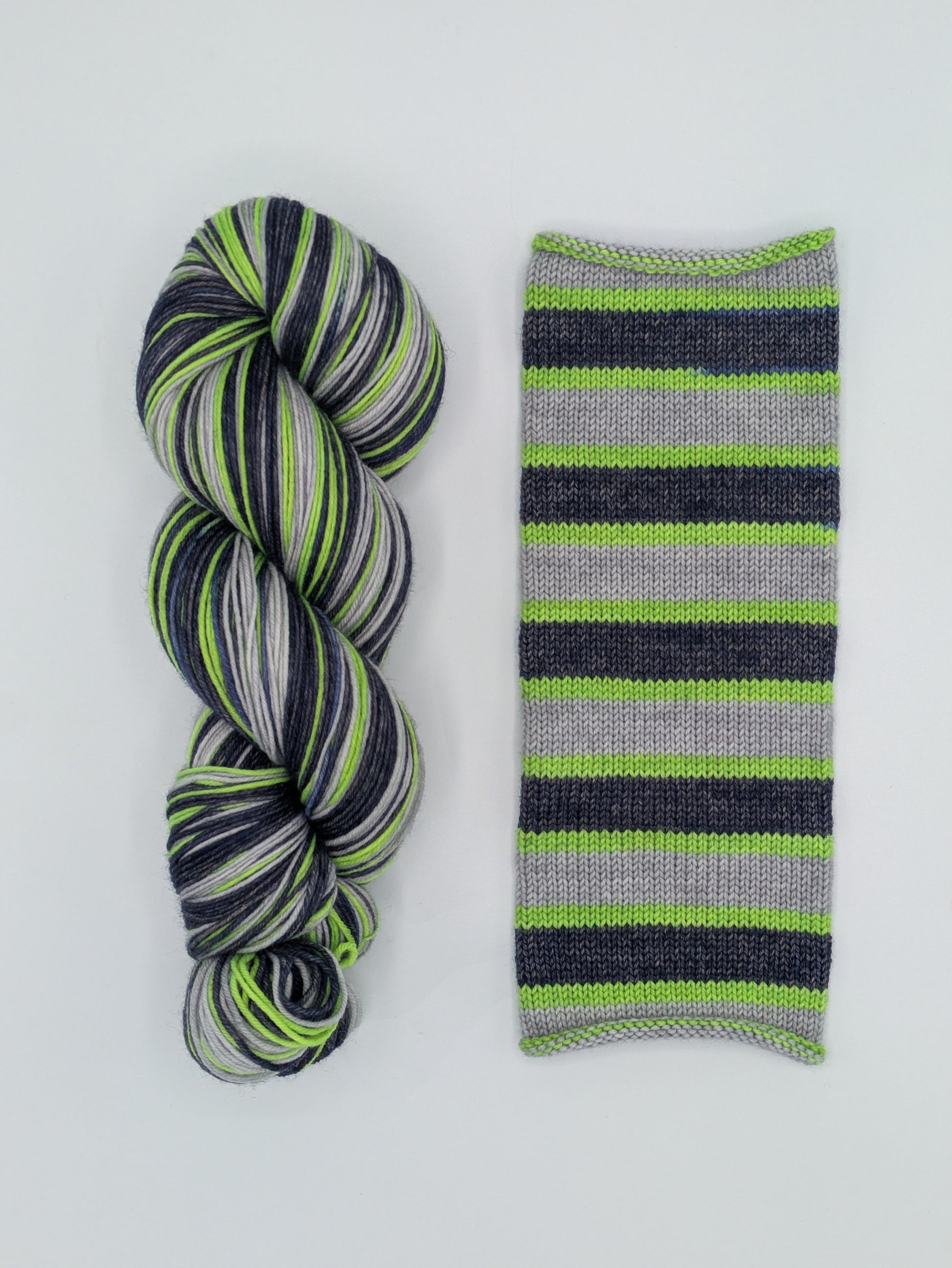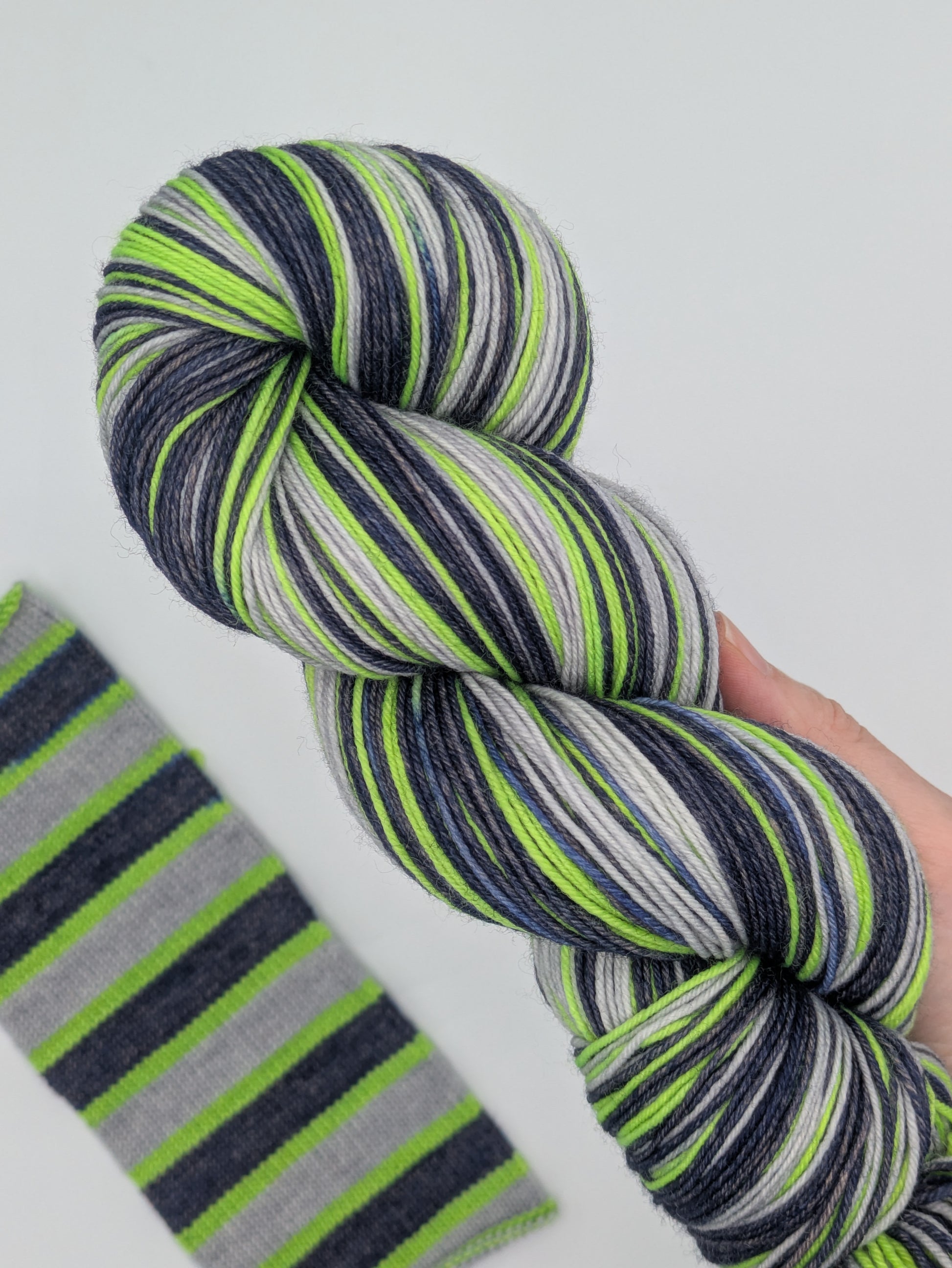 The Twelfth Man is a self-striping yarn featuring thick stripes of navy blue and gray with thin stripes of neon green in between. The Twelfth Man is the team colors for the Seattle Seahawks.